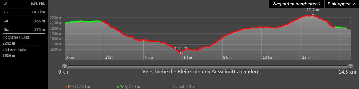 Voor deze wandeling staat ongeveer 800 m stijgen, 900 m dalen, lengte 15 km en wandeltijd 5½ uur (zonder pauzes).