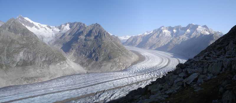 Voor wie klauteren over rotsblokken geen probleem is, kan hier van de route afwijken en de Grosser Aletsch Gletscher heel dicht naderen; misschien zelfs wel aanraken.