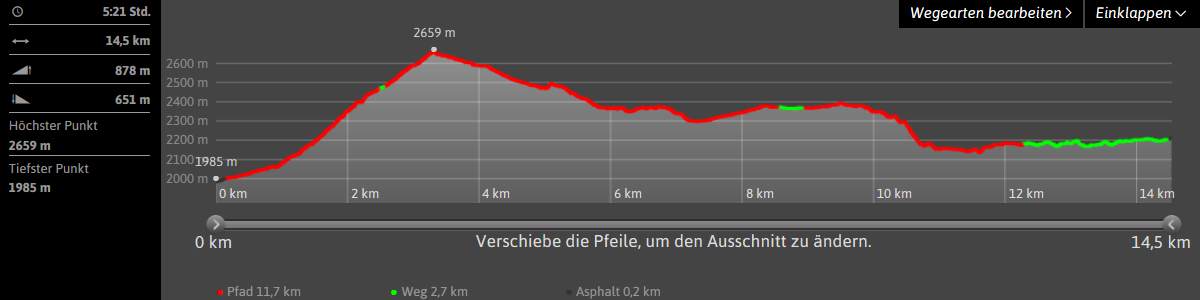 Ongeveer 900 m stijgen, 700 m dalen, lengte 15 km en wandeltijd 5½ uur (zonder pauzes).